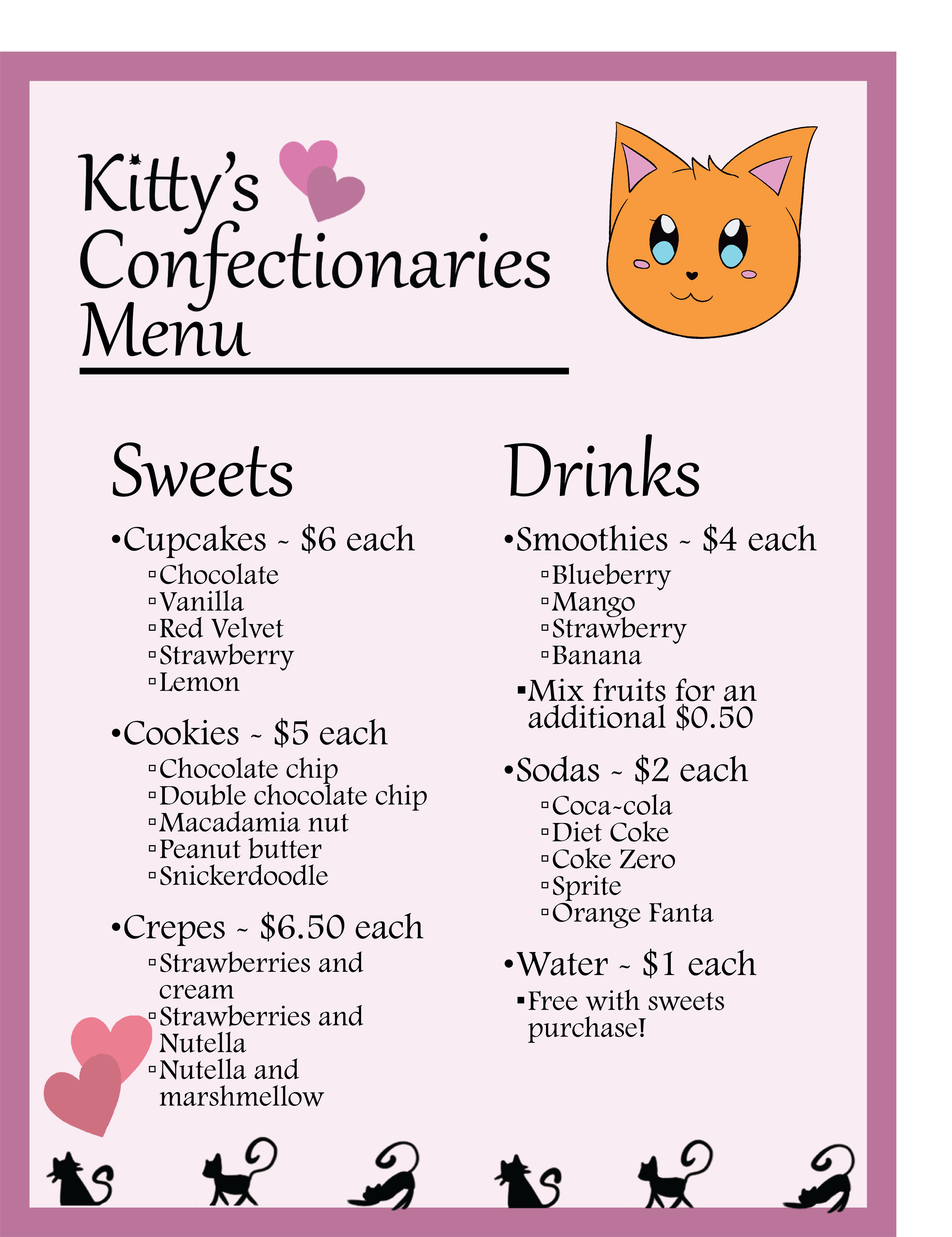 When designing Kitty’s Confectionaries, I wanted to really tap into cute drawings and bright colors that cheer people up just by looking at them. The use of hearts, cats, and stars appeals to the audience of anyone who likes anything cutesy!